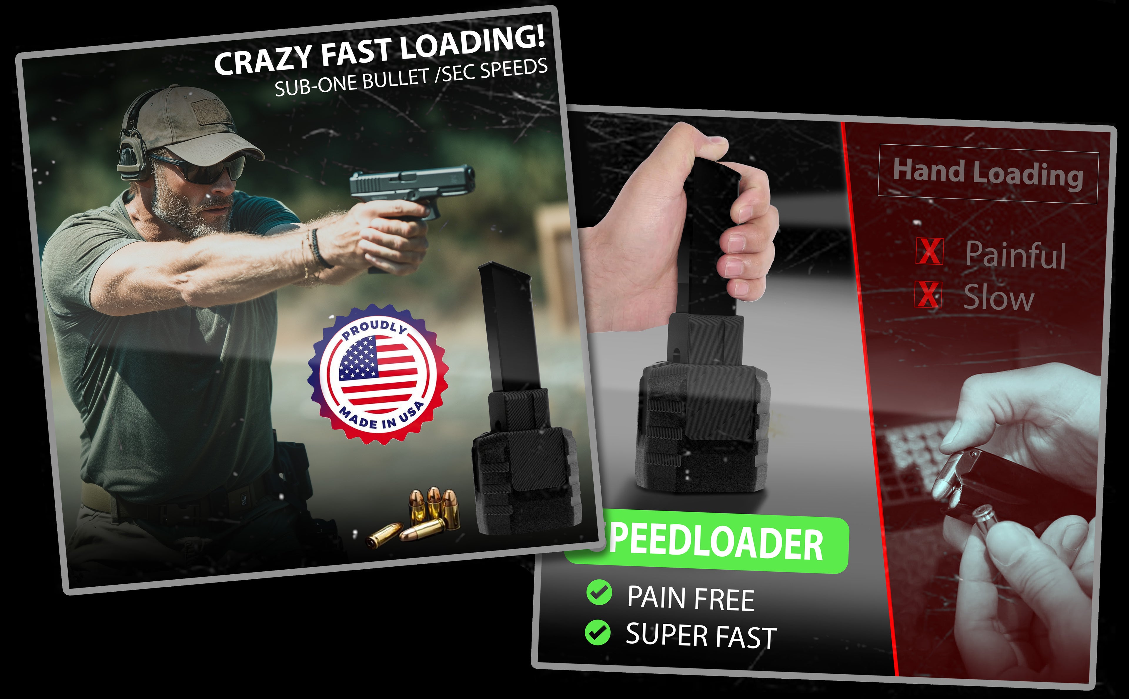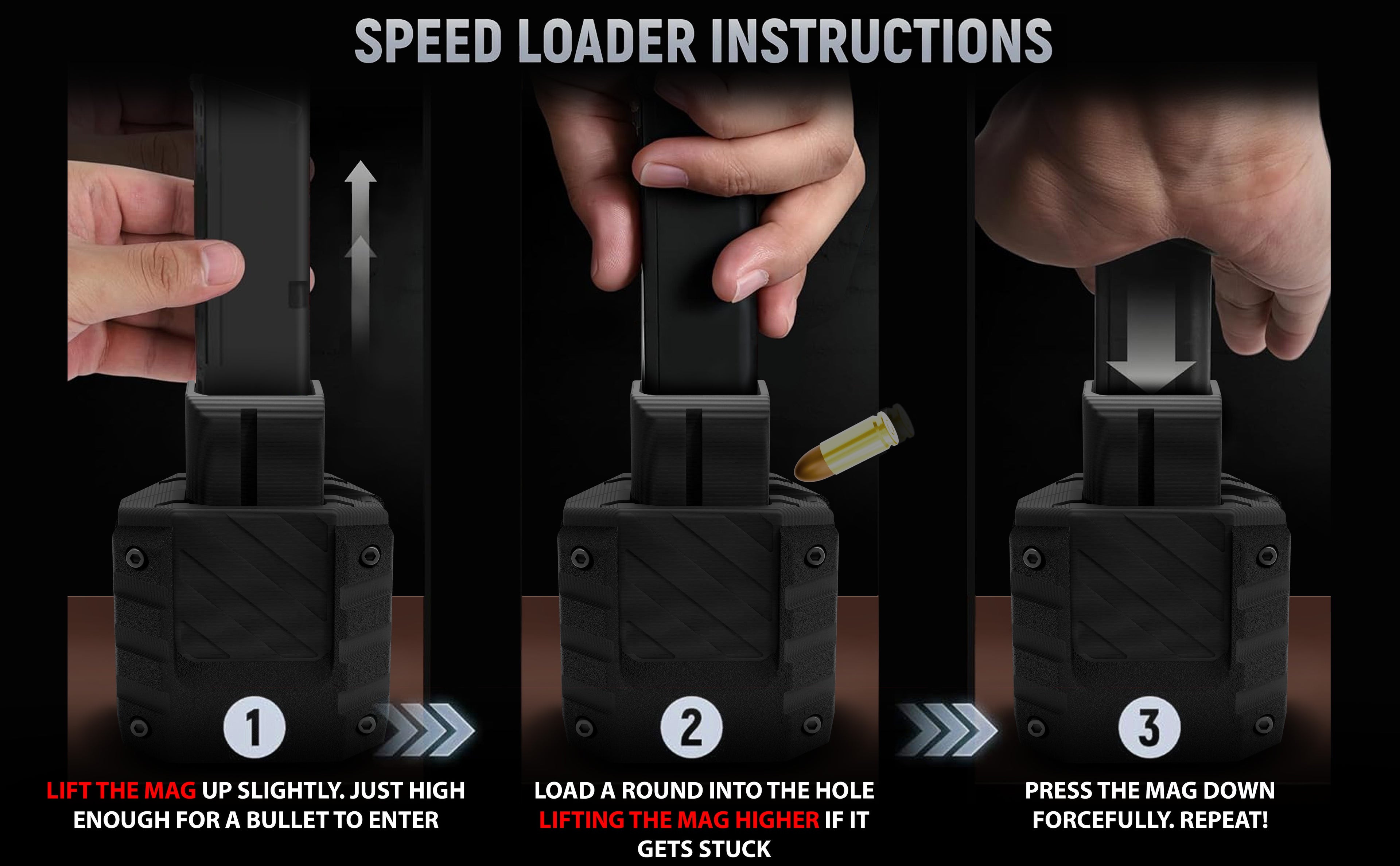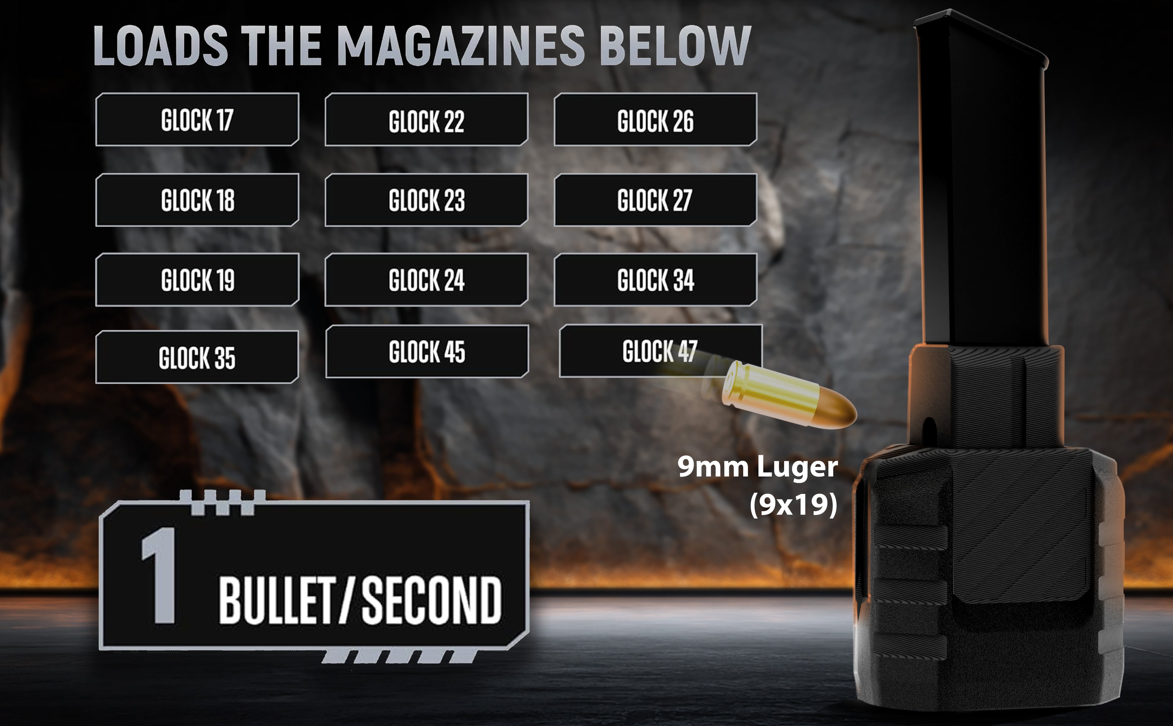 Engineered specifically for Glock magazines in 9mm and .40 S&W, the loader provides a fast, low-effort loading experience — no more sore thumbs or slow, awkward seating. Simply place the magazine and engage the loader for a smooth, sub-1-round-per-second loading cadence. The compact design is lightweight, ergonomic, and made to withstand repeated use.